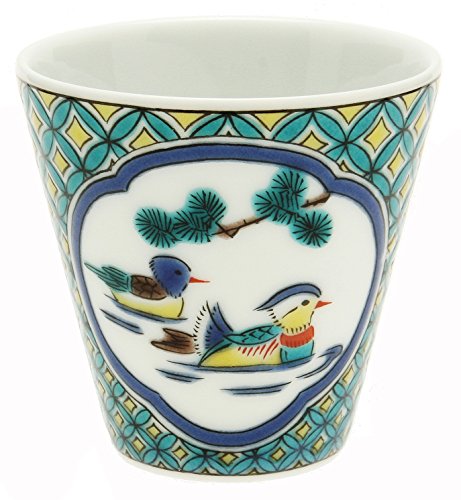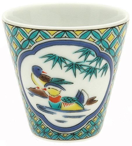 Kutani ware is one of the most famous types of ceramic ware in Japan, and dates back to the 17th century. The porcelain style is known for its bold colors of reds, greens, purples, blues, and yellows, used to create ornate designs depicting landscapes, flowers, birds, and cultural artifacts and scenes. This sake cup depicts two mandarin ducks with very different plumages. Mandarin ducks are believed to be lifelong couples, unlike other species of ducks. As such, they are regarded as a symbol of fidelity and lifelong companionship. Also, because male and female ducks have strikingly dissimilar plumages, they are thought of as yin and yang, or an "opposites attract" couple that balance each other out by virtue of their differences.