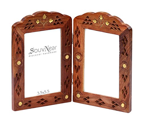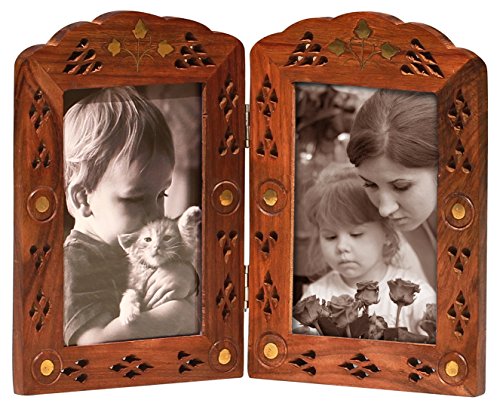 Double Photo Picture Frame - Wood Two Photo Frame for 3.5”x5.5” Photos Vintage-Look Hand-Carved Lattice & Brass Inlay Work - Tabletop Home Decor Accessories - Valentine's Day Gifts