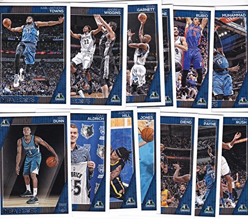 This is a brand new 2016 / 2017 Minnesota Timberwolves Hoops Basketball Factory Sealed NBA Licensed 13 Card Team Set including Karl-Anthony Towns, Andrew Wiggins, Kevin Garnett, Zach LaVine, Ricky Rubio, Shabazz Muhammad, Cole Aldrich, Jordan Hill, Tyus Jones, Gorgui Dieng, Adreian Payne, Brandon Rush and a rookie card of Kris Dunn.