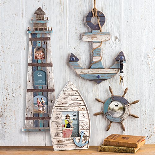 -. Feature : Wood frame in the shape of a ship's wheel / Distressed wood with blues and white / Wall hangers for easy wall display / Displays a 4x4 photo / Overall size 10.25 x 10.25 x .75