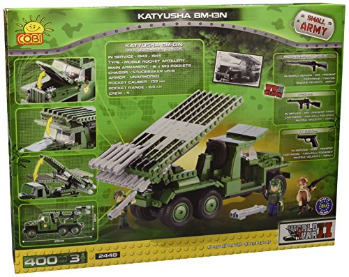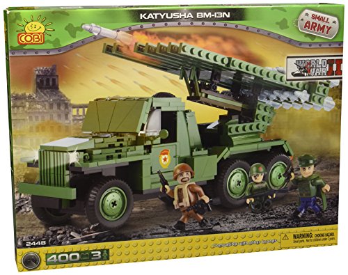 -. Binding : Toy -. Brand : COBI -. Color : Green -. Department : unisex-child -. EAN : 5902251024482 -. Feature : Build a new adventure with COBI construction sets (each sold separately) / Build the Russian rocket launcher Katyusha BM-13 / This Small Army set contains 400 pieces and 3 figures / This COBI block tank model is equipped with many movable parts / This item is a great addition to the extended Small Army collection -. IsAdultProduct : 0 -. ItemPartNumber : 2448 -. Label : Cobi Toys, LLC -. Manufacturer : Cobi Toys, LLC -. Model : 2448 -. MPN : 2448 -. PackageQuantity : 1 -. PartNumber : 2448 -. ProductGroup : Toy -. ProductTypeName : TOYS_AND_GAMES -. Publisher : Cobi Toys, LLC -. Size : Standard -. Studio : Cobi Toys, LLC -. Title : COBI Small Army Katyusha BM-13 Building Kit -. Warranty : 90 day warranty against manufacturer defects