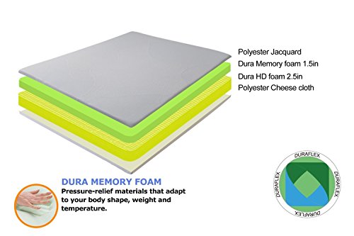 -. Feature : 2.5 Inch High density foam supports your back line / 1.5 Inch Memory foam Layer adapts to your body shape , weight and temperature / 5 YEAR MANUFATURE WARRANTY - 100%GUARANTEE Buy with confidence knowing that your new mattress is backed by our 5year manufacture warranty. with outstanding customer service your purchase is risk-free / Perfect Combination Memory foam and HD Foam ILD 8, ILD 28 / Mattress Topper comes compressed and rolled for easy shipping