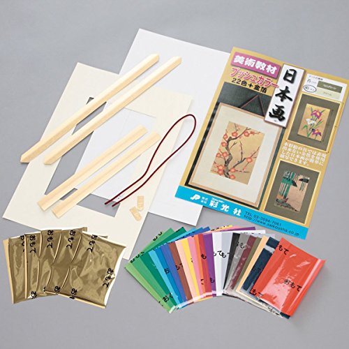 -. Feature : セット内容:専用粘着白制作板(B4判)、不透明プッシュカラー(100×120mm)22色+金(87×125mm)5枚、マット(絹)、外枠金紙、展示用ひも / 水彩画の世界では表現できない金箔を使用した日本画が簡単に描写できます。 / プッシュカラー・プッシュステンドカラーは粘着面に転写できる転写箔です。 / 粘着面の剥離紙を切り絵の要領で図案を切りはがしたところにカラー箔を載せて押さえるとカラーが転写します。 / カラー箔の押さえ方などを工夫したいくつかの技法があり、フラットな色表現だけでなく点描風混色表現やぼかし、スクラッチなどの技法を組合せることでユニークで豊かな表現ができます。