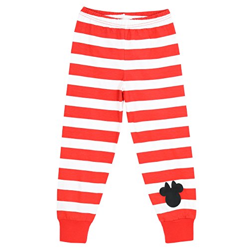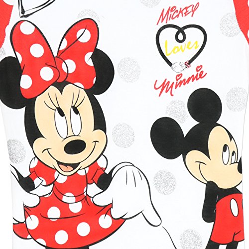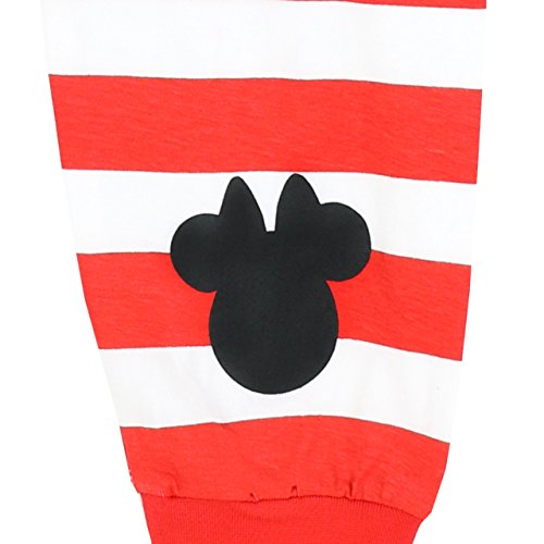 Minnie Mouse pajamas. Girls Minnie Mouse pj's comprising a long sleeved top with large print of the lovable Minnie and Mickey Mouse surrounded by glistening spots with the slogan 'Mickey Loves Minnie'. The bottoms have bold red and white stripes with a soft touch Minnie silhouette on one leg, finished off with cuffed legs and elasticized waist for added comfort. Made from soft, high quality cotton these are perfect for any Minnie fan.Feature