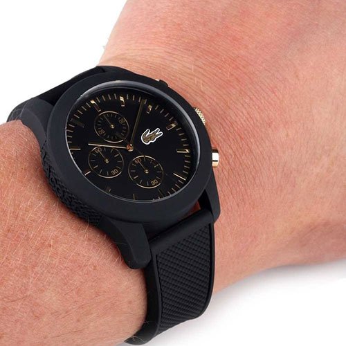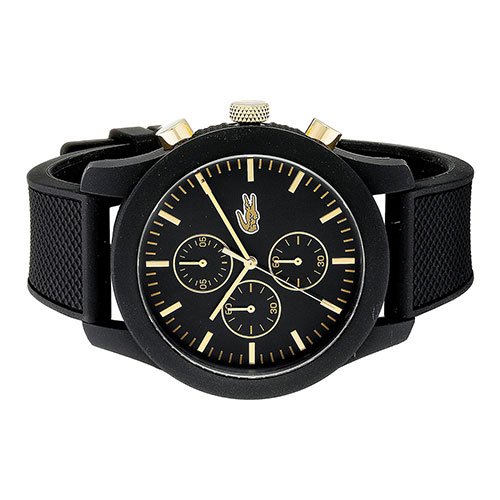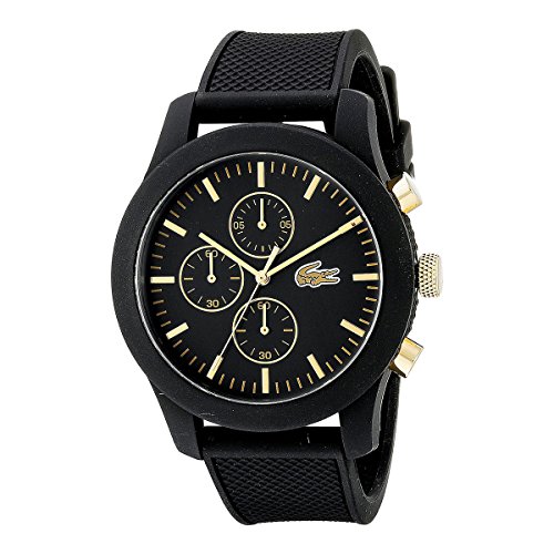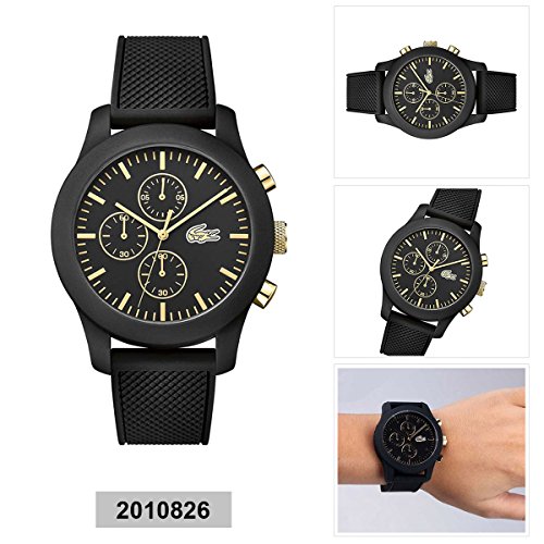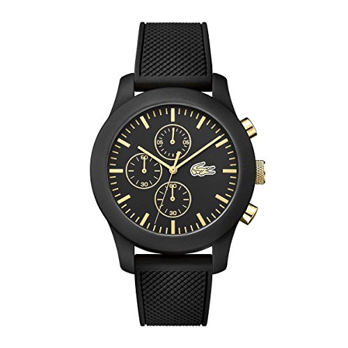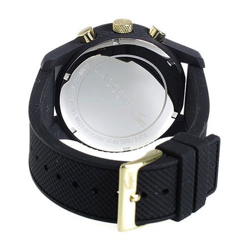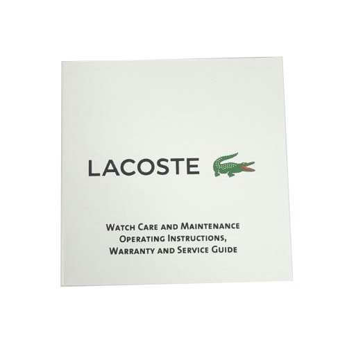 Studio : Lacoste (Movado Group Inc) Publisher : Lacoste (Movado Group Inc) Binding : Watch Product Description Stainless steel case back. Silicone wrapped case. Silicone strap with adjustable buckle closure. Round face, 44mm. Three-hand analog display with quartz movement. Dial features gold-tone hands and hour markers, Lacoste detailing, and three subdials. Water resistant, 5 ATM. Imported. 0