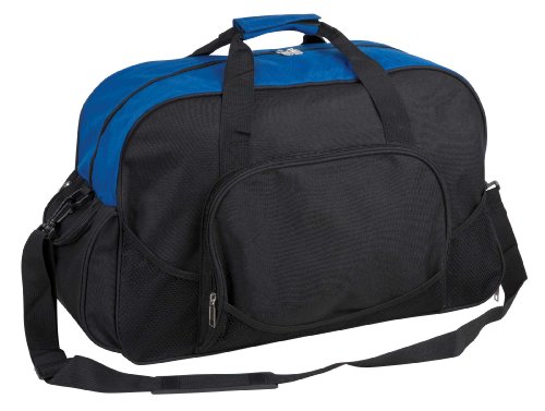 -. Feature : FEATURES: Large zippered main compartment, zippered side pocket, end pocket for shoe storage. / MATERIAL: 600D Polyester. / SIZE: 21" X 14" x 9". / COLORS: Black, Black/Royal, Black/Red, Black/Gold / INTENDED USE: GYM, SPORTS ,TRAVEL, LAGE BAG, EVERYDAY Duffle Bag