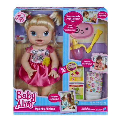 - Feature : Your little one will love feeding and taking care of her Baby All Gone doll while the doll talks in English or Spanish / More than 30 phrases / Interactive doll drinks and wets her diaper / Includes 2 food packets to make doll food for the bottle / Includes My Baby All Gone doll, outfit, 2 diapers, 2 food packets, bowl, spoon, bottle and instructions