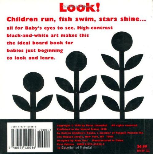 Look, look! Children run, fish swim, stars shine . . . all for baby's eyes to see. This sturdy board book, full of high-contrast black-and-white cut-paper art perfect for staring at, is just the thing for the eyes of the youngest babies. A few words in curving red type on each spread describe the scenes -- a car races, a cat stretches, flowers bloom-- and extend the book's age appeal so that it will be fascinating to older babies, too. Striking and stylish, Look Look! is the ideal first board book for babies just beginning to look and learn. Peter Linenthal is an illustrator who has taught art in elementary schools for twenty years.Feature