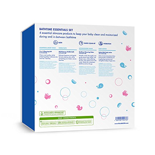 A collection of baby bath time favorites, the Bath Time Essentials Set includes 4 essential plant-based skincare products to keep your baby clean and moisturized during and in-between bath time. The Bath Time Essentials Set is packaged in a deluxe keepsake box and each product is formulated with Avocado Perseose, a patented natural ingredient to help protect and hydrate your baby's delicate skin. The Bath Time Essentials Set includes: (1) 2-in-1 Cleansing Gel (6.76 US FL OZ): Cleans and soothes while protecting a baby’s delicate skin and hair. (2) Multi-Sensory Bubble Bath (6.76 US FL OZ): Gentle formula cleanses skin while stimulating your baby's senses. (3) No-Rinse Cleansing Water (3.38 US FL OZ): Micellar water that thoroughly and gently cleans face, body, and diaper area, while softening the skin. No need to rinse with water. Perfect for in-between bath time and on the go. (4) Hydra Bébé Body Lotion (10.14 US FL OZ): Daily moisturizing body lotion that provides immediate long-lasting moisture and strengthens a baby’s fragile skin.Feature