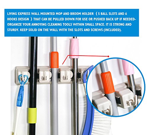 LIVING EXPRESS-Wall Mounted Organizer-ABS Mop and broom Holder Rack with 5 Ball Slots and 6 Hooks Holds up to 11 Tools