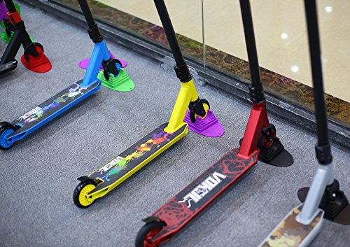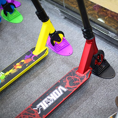 Feature : Clean up your garage or hourse for the scooter which save space and give your kids scooter have a more better location.(3-7days delivery time with free shipping) / Okay for 95mm-110mm wheel like Vokul scooter,Razor A,A2,Fuzion X-3/Z250 and other brnads like Madd Gear, Phoenix, JD Bug, Grit, Envy etc.(Six Kinds Color can fit relative Scooter color) / With 57*11*6.5inch size and 0.31Lbs weight that big and heavy enough to hold up scooter steadily to avoid tip over.(concrete Ground is okay considering the friction) / Carrying anywhere with your scooter or screw it down in your garage,the scooter stand have three hole for the intalled more tighten. / Fit tightly,avaliable colors,perfect design make the scooter experience more happy and the stored scooter place much more organized.