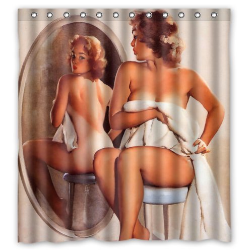 Sexy Bathroom Art Shower Curtain Pretty Naked Girl in Front of the Mirror - Vintage Retro Pin Up Girls Body Art Work Canvas Painting Style Waterproof Polyester Fabric 66(w)x72(h) Rings Included