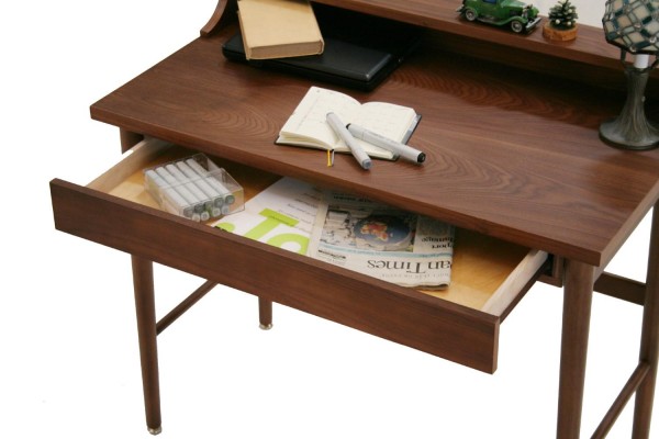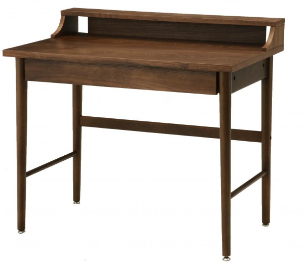 | 天然素材(突板)のため木目が美しく暖かみが溢れています。ミッドセンチュリー家具を彷彿とさせる、味わいのあるデスクです。卓上前面にはW900×D100mmの小物や雑貨を置く棚板があり、お気に入りの雑貨や小物を飾ることができます。背部には、パソコンのコード等を通す為の穴があります。 |