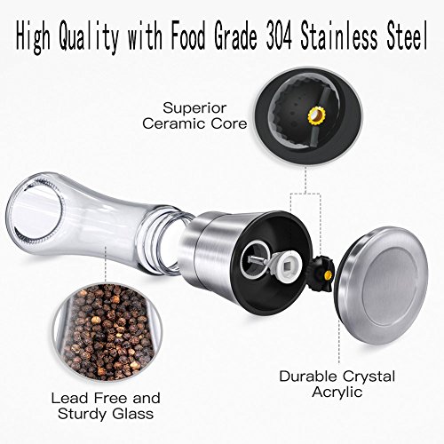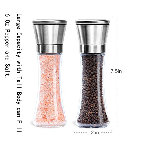 Material:Food grade 304 stainless steel Thickened glass bottle Ceramic Grinding Rotor Metal nuts. Dimension:Height 7.5In/19cm,upper and lower diameters 2In/5.3cm. Weight:0.64pounds/0.29kg.