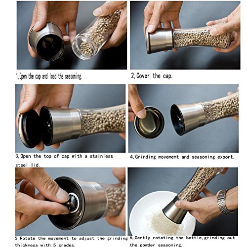 ●This grinding mill is made of food grade 304 stainless steel,strong and durable,not get rusty. ●Ceramic grinding core,hardness,grinded resistance,can be water washed,environmentally friendly,non-toxic,not pollution. ●select high quality lead-free white glass frit,transparent visual design, easy to control the quantities. ●5 grades grinding of the thickness,according to spices free to adjust the size.