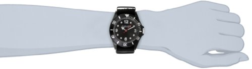 Black plastic case with a black nylon bracelet. Uni-directional rotating black plastic bezel. Black dial with silver-tone hands and dot hour markers. Arabic numerals mark the 3, 6, 9 and 12 o'clock positions. Minute markers around the outer rim. Dial Type: Analog. Luminescent hands and markers. Quartz movement. Scratch resistant mineral crystal. Pull / push crown. Solid case back. Case diameter: 42 mm. Case thickness: 12.5 mm. Round case shape. Band width: 21 mm. Band length: 9 inches. Tang clasp. Water resistant at 10 meters / 33 feet. Functions: hour, minute, second. Casual watch style. August Steiner Juniors Black Plastic and Nylon Watch AS8061BK.Feature