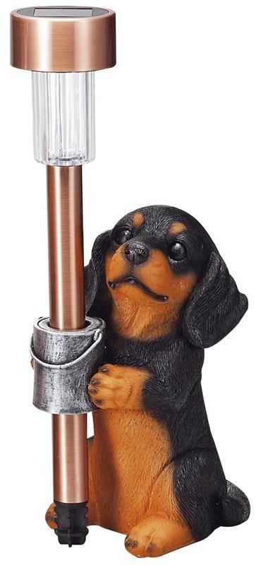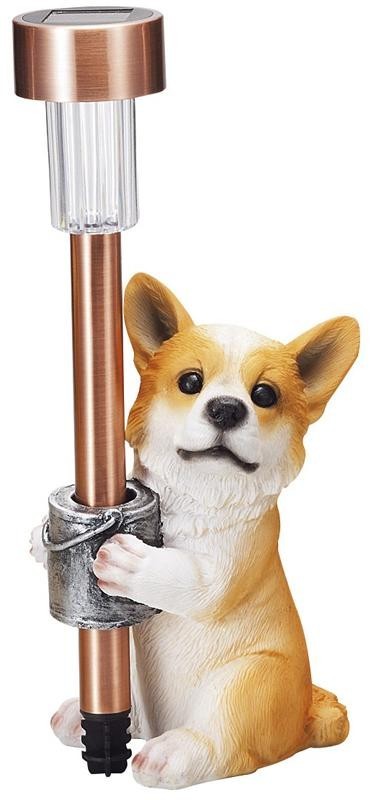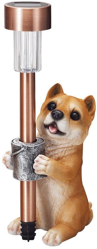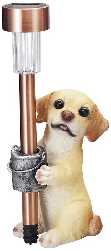 とってもかわいい表情をしている子犬付きのソーラーライトです。お庭や玄関先にいかがでしょうか?昼間太陽の光で充電して、夕方暗くなるとライトが点灯します。点灯時間の目安は、受電時間や太陽の光の強さにもよりますが、約3~5時間程度です。 |