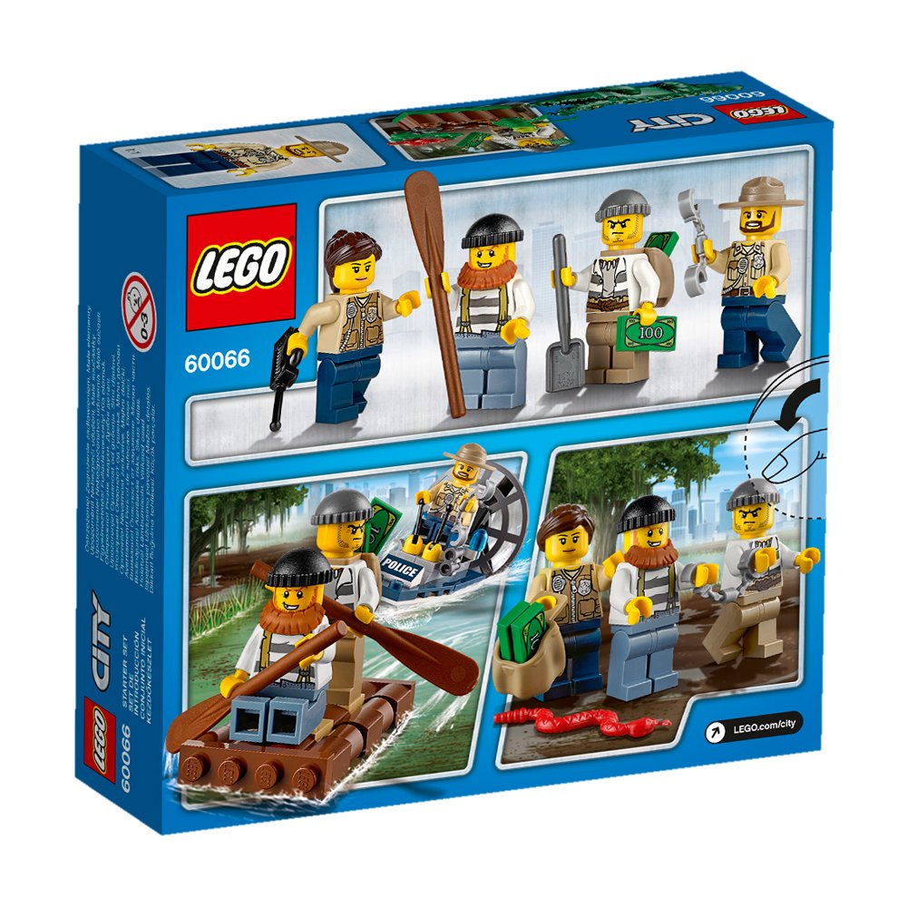 Drobow is running away in Ikada with lots of stolen goods! Start with a high speed boat! Be careful of the belly peco croche hiding in a swamp! With 2 police officers, 2 body bugs mini figures.