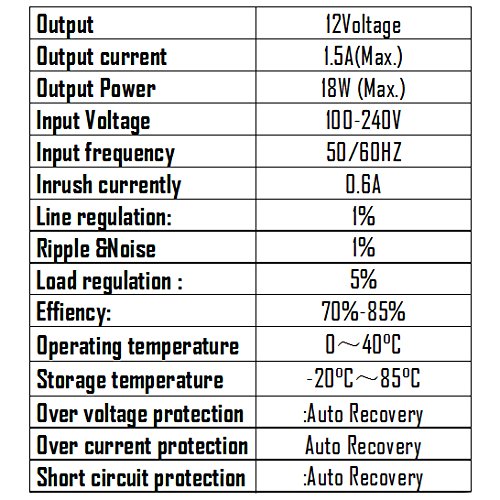 -. Feature : IMPORTANT INFORMATION: Professional Security Adapter for better Current Stability (increases the lifetime of your camera) / Input: 100-240V AC 2.1mm ; exterior: 5.5mm 12v powersupply / Real Output: 12V 1.5A 18W / Over-Voltage Protection And Over-Current Protection / For the Security Cameras, DVR, Led Strip, Led string lights, Wireless Router, ADSL Cats, HUB, Switches, Audio/Video Power Supply