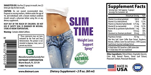 SLIM TIME Spray is a maximum strength weight management formula consisting of natural ingredients: Garcinia Cambogia, Aloe Vera Leaf, Green Coffee Bean, Raspberry Ketones, Green Tea Leaf, 5-HTP, Guarana Seed and vitamins A, D, B3 and B6.