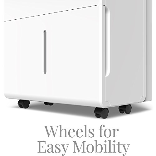 WITH WHEELS AND CONTINUOUS DRAIN HOSE OUTLET - Safe dehumidifier includes built-in handles and wheels for easy transport, and features a drain hose outlet for continuous draining as well as a removable water tank that can be emptied manually (hose not included with purchase)