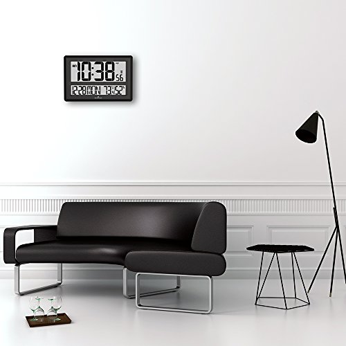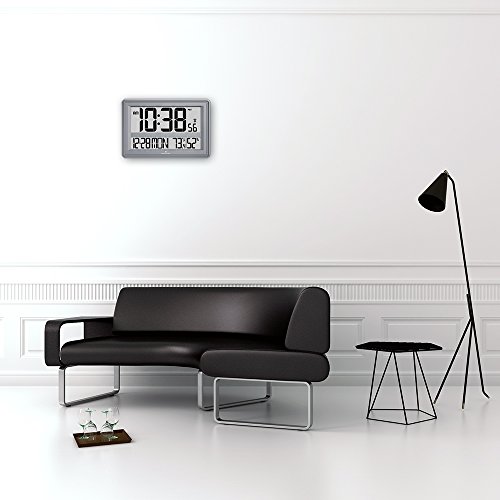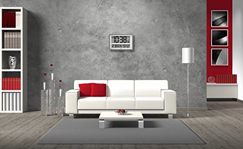 -. Feature : Measures 17 x 11 inches with 5 inch digits. / Features day, date, indoor temperature & humidity / Automatic self-setting and self-adjusting / 7 languages (English, Danish, Dutch, French, German, Italian & Spanish) / Wall mountable with fold out table stand