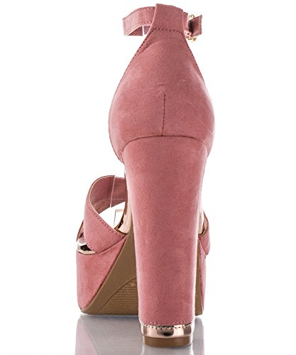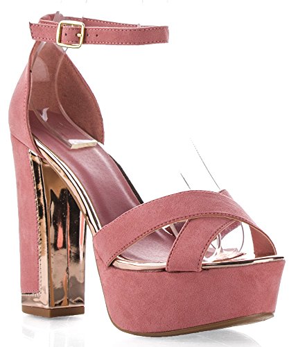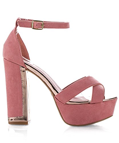 Product Description This open toe heel features a vegan suede fabrication, one band across vamp, covered platform, and adjustable ankle strap with buckle closure. Finished with a lightly padded insole and chunky wrapped heel. 0