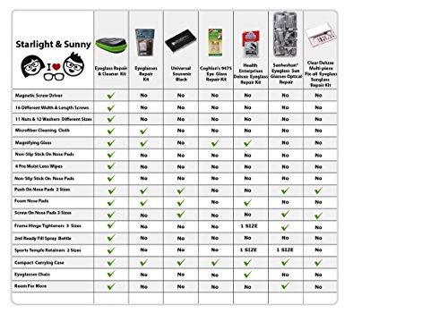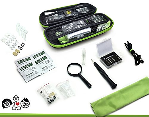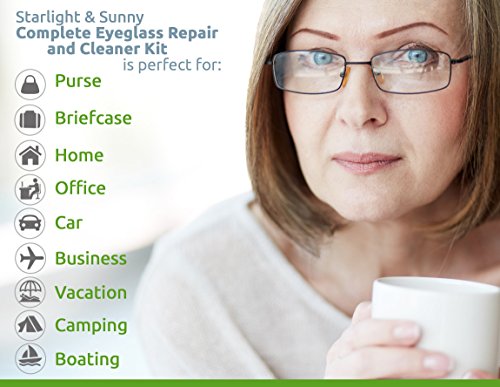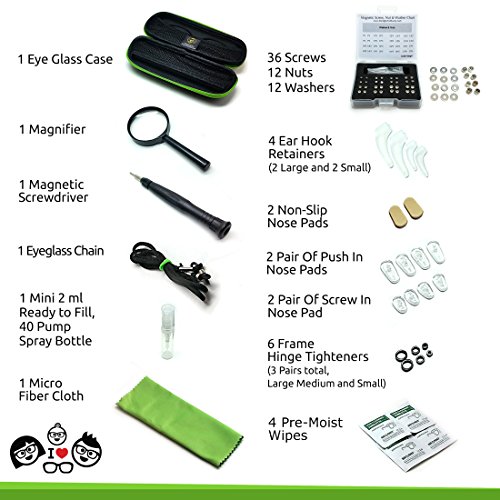 QUICKLY CLEAN, REPAIR & MAXIMIZE LIFE SPAN OF YOUR FAVORITE LENSES: Utilize pre-moistened lens wipes, microfiber cleaning cloth and ready to fill mini-spray bottle for a streak-free shine. Four types of nose pads, three sizes of frame hinge tighteners, temple retainer in two sizes and a secure eye-glass chain to fit your style.