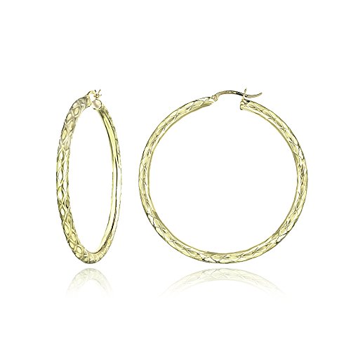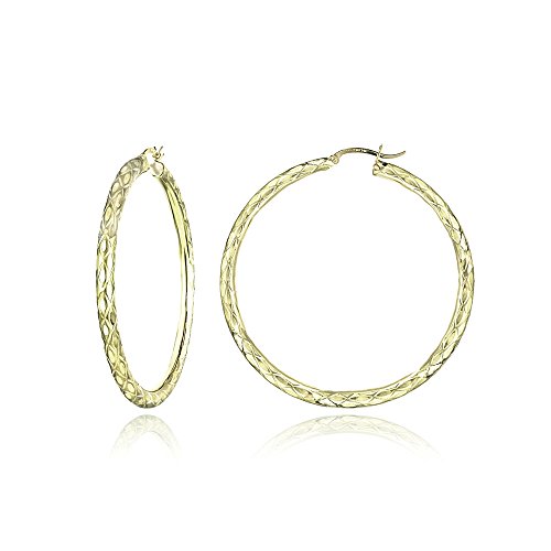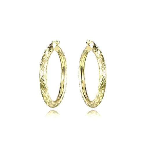These earrings display a pair of diamond cut hollow tube hoops. They are lightweight, have a comfortable fit and are an ideal size for daily and evening wear. These medium hoop earrings are approximately 1 ½ inches in diameter. They are high quality fashion earrings, crafted of 14k yellow gold and secure with click-top back findings.