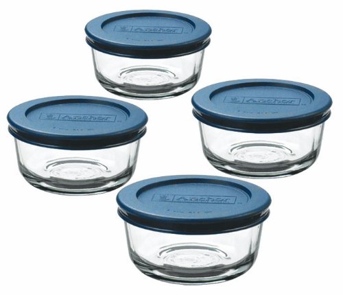 Studio : Anchor Hocking Publisher : Anchor Hocking Binding : Kitchen Product Description Set of 4 Containers with Lids shrink wrapped together. 1-Cup round glass containers with blue plastic lids. Clear glass makes it easy to see what is being stored inside! Glass is oven safe to 425 degrees, microwavable, freezer and refrigerator safe. Glass is dishwasher safe Use top shelf of your dishwasher when washing the lids. Glass is made in the USA. 0