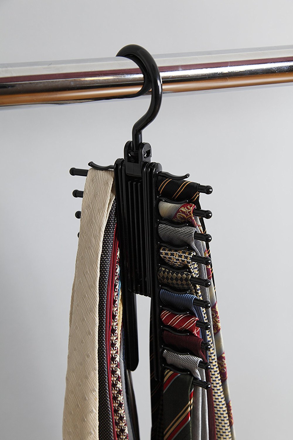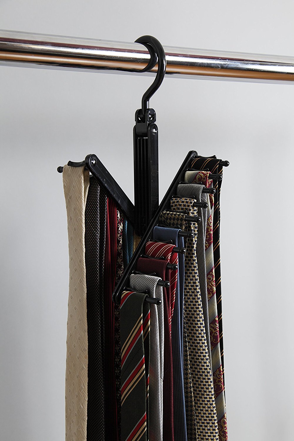 I used various tie hangers, but I did not find anything I liked. This product can store a lot of ties for easy viewing, and since the hook part turns 360 degrees, it is very easy to put, to choose and to put out, I like to be able to store it more compactly than anything else. We have two in one pack. We were able to store tie which we had in large amount with afford.