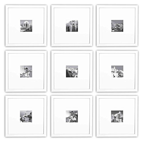 -. Feature : Set contains 9 11x11-inch Square Photo Frames w/ Mat. Color: White / Frame Includes a Single White Color mat (opening size: 3.5x3.5) for 4x4 pictures / Can Display Pictures: 11x11 (without Mat) or 4x4 (With White Color Mat) / Overall size (per Frame): 12 x 12 x 0.75 inches. / Material: Wood & Real Glass.