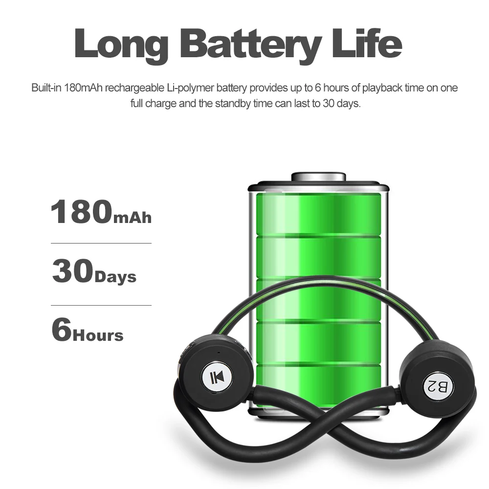 Long Battery Life: Built-in 180mAh rechargeable Li-polymer battery provides up to 6 hours of playback time on one full charge and the standby time can last to 30 days.