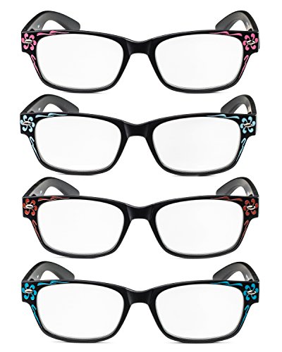 Specs Rectangular Reading Glasses is an essential for anyone who has trouble with their vision. Sides and front of frames feature an elegant flower pattern, which was designed for either women or men. Square shaped lenses compliment all face shapes and sizes. High quality crystal clear lenses are scratch resistant, enabling you to read small text where ever you are. No matter what activity you're doing, get the magnification strength that you need, whether you're crafting, reading newspapers, or on the computer. Spring hinges stretch and cushion the nose, providing extra comfort and all day wear. Set of 4 allows you to conveniently keep a pair of reading glasses where ever you need them. Perfect for keeping in the car, at the office, or even at home.