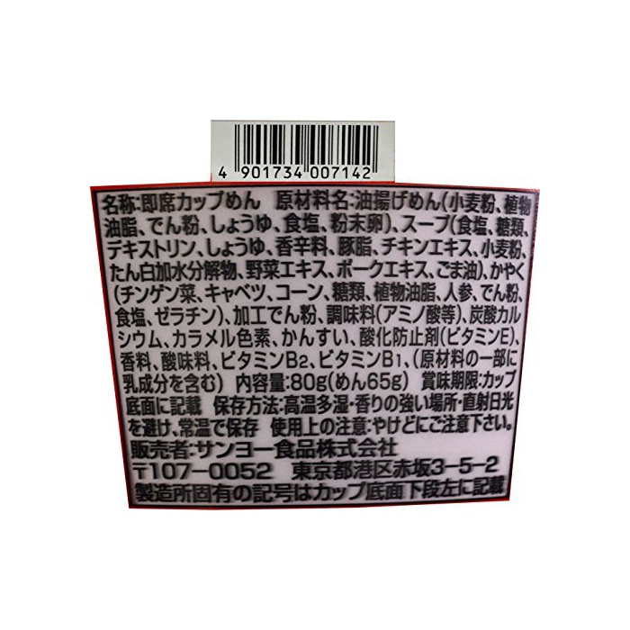 원재료:유부 면(소맥분,식물성 기름지,나오지 않겠 분,간장,식염,분말란)고, 스프(식염,당류,덱스트린,간장,향신료,돈기름,치킨 엑기스,소맥분,단백 가수분해물,야채 엑기스,포크 엑기스,참기름)고, 인지(든가) 질투하다(친 겐채,양배추,콘,당류,식물성 기름지,(당근)인삼,나오지 않겠 분,식염,젤라틴)고, 가공 나오지 않겠 분,조미료(아미노산등)고, 탄산 칼슘,카라멜 색소,물어 들이마시고, 산화 방지제(비타민E)고, 향료,신맛료,비타민B2,비타민B1,(원재료의 일부에 유성분을 포함한다)