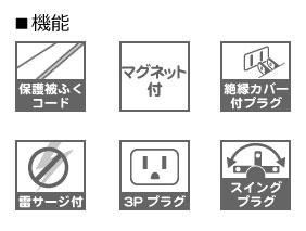 | 仕様 | 口数:5、コード長:2m 最大サージ電圧:6000V 制限電圧:650V 定格容量:125V・15A、合計1500Wまで |