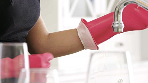 Studio : Casabella Publisher : Casabella Binding : Kitchen Product Description The Casabella Premium Waterblock Gloves are new and improved! We have upgraded our distinctive Waterblock cuff by creating a double cuff, making it even more effective in catching drips and keeping hands soft and dry. The gloves feature a cotton flocked inner-lining and are made in the perfect shade of pink. They are made of durable 100% Latex that allows your hands to breathe. The gloves are contoured for a perfect fit and are sized to ASTM (American Society for Testing and Materials) standards. The sizing is a true glove size, so may be a more snug fit than the original glove. Improved grip pattern allows you to handle even the most fragile and delicate items. Do to the upgrades in design and production, this new model of Casabella gloves is patent-protected with a new patent number. The gloves are great for dish washing, car washing, oven cleaning and other common, household chores. Now made in Taiwan. 0