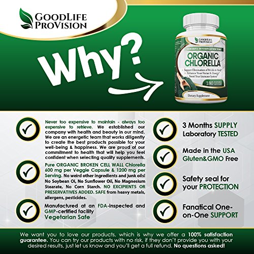 -. Feature : YOUR HEALTH IS P.R.ICELESS: Never too expensive to maintain - always too expensive to retrieve. We are proud of our commitment to providing information and education that will help you feel confident when selecting quality supplements. That's why we include the bonus guides to help you navigate through the world of Health Improvement and Daily Detox. Just contact us after your purchase and we will gladly send them to you. / HIGH QUALITY: VEGETARIAN SAFE. VERY EASY TO TAKE & NO AFTERTASTE. We've encapsulated your daily dose of fresh Chlorella organic powder into easy swallow vegie caps so that it will not leave horrible green staining in your teeth and no aftertaste. Plus Every Bottle goes through rigorous Quality Control and is made in a GMP-quality certified facility in the USA & produced from Pure Uncontaminated Waters in the USA. Free from Heavy Metals, Radiation, non-GMO and Gluten FREE. / REAL RESULTS YOU CAN FEEL: our ORGANIC CHLORELLA superfood detox pills are specifically formulated to promote your Cell Rejuvenation, partnered with a Healthy Lifestyle, support your Natural Detoxification, Benefit your Eye, Brain & Skin health, help you slow down your cellular damage, support Better Sleep, Weight Loss and Feeling Good! You will feel this working from the very first months you put it to use, and that's a good thing as it's how you know it's actually working! / ENERGY BOOST IS AN ADDED BONUS. It is such a pleasure to come home after a full day of work, and have the energy and enthusiasm to enjoy the evening! / 1200MG FORMULA & 3 MONTH SUPPLY: easy to use for active people who want to set themselves up for success every day. A nice way to get a suitable dose of Chlorella for you and enjoy all its benefits. Our pure good natured Chlorella tablets allow you to choose the best dosage for you - 600 mg or 1200 mg. If you prefer to double the dosage, simply take 2 tablets a day! Chlorella detox caps are best partnered with Spirulina as well, so check out our Organic Spirulina powder also.