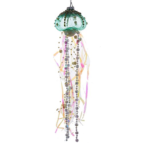 -. Feature : Glass Jellyfish Ornament w Tinsel and Beads Tenticles. / Size: 12 inches. / Christmas Ornaments Decorations and Coastal, Nautical Sea Life Jellyfish Themed Holiday Decor by Kurt S. Adler.