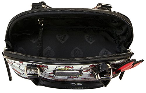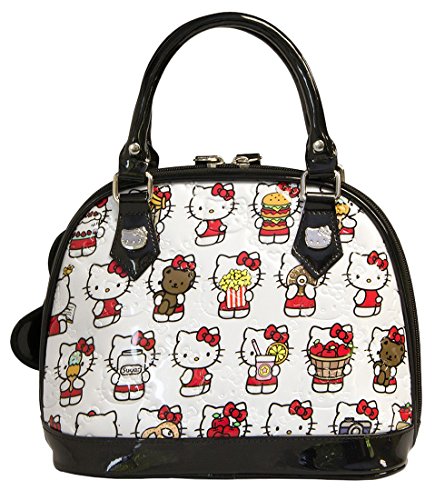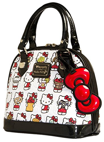 Printed patent mini dome bag with embossed details. Hello Kitty head stud details and bow charm. Measurements: W: 9.5" X H: 8" X D: 5"