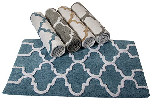 -. Feature : 100Percent cotton, provides high water absorbance, perfect for bathroom use. Super soft and plush / Two tone geometrics pattern / Machine washable and Dryable for easy care; less prone to shrinking or pilling and retains color better, even after repeated washings / Dyed with azo free dyes. Superior high quality hand tufted durable construction / 180 GSF 'grams per square feet' thickness/weight. Higher the weight, will not slip, but recommend to use rug pad. Multiple sizes (50x30, 36X24, 34x21)