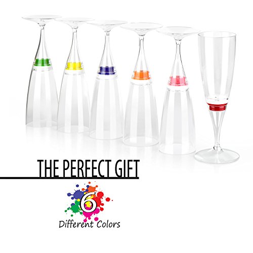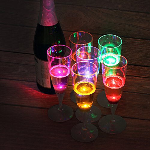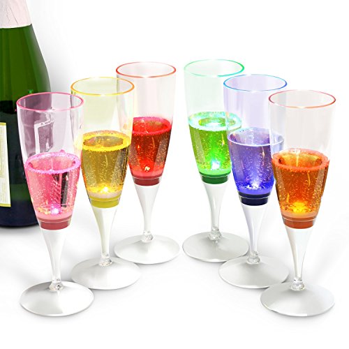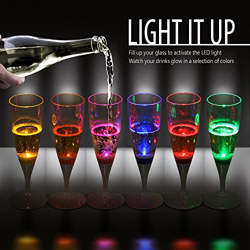- 6 DIFFERENT COLORS: The set comes with 6 champagne flutes all with their own unique color LED light. Colors include: Pink, Yellow, Red, Green, Blue and Orange