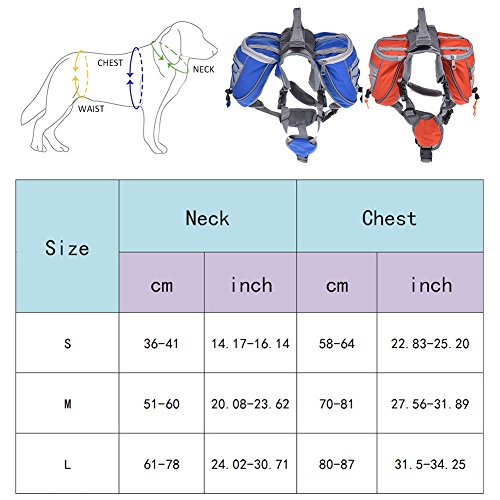 -. Feature : S: Neck * Chest: 36-41cm / 14.17-16.14in * 58-64cm / 22.83-25.20in; Made of nylon fabric material / Easy to install and wear; Adjustable shoulder strap and soft mesh design to bring comfort to your pet / Usage: to provide storage for the dog food, toys, water, keys, wallets, mobile phones and other small items / Reflective strip and bright color design to improve visibility; Handle on the top to facilitate you to take the pet and mount the trachable leash at any time / There is drawstrings on both sides of the bag, which can play a role in shrinking the outer bag or decor function; Suitable for walking, shopping, mountain climbing, jogging and so on