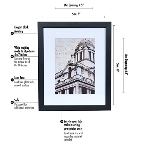 Use:Ideal 8x10 photo frame for people portraits and scenery pictures. Sized 5x7 inches with mat or 8x10 inches without mat. Comes with hanging hardware to hang the frame on the wall and a built in easel stand to display on desktop.