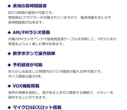 -. Feature : 録音ファイル形式:MP3, 再生ファイル形式:MP3, 周波数特性(L):100Hz, 周波数特性(H):20000Hz / メモリ容量:1GB, 対応メモリーカード:microSDHC / 内蔵マイク数:1, マイク可動:非対応, 指向性切替:非対応, 外部マイク:対応 / ローカットフィルター:非対応, ノイズキャンセル:非対応, 自動録音:対応 / USBダイレクト接続:対応, バッテリータイプ:内蔵バッテリー, バッテリー駆動時間(録音):27時間, バッテリー駆動時間(再生):50時間