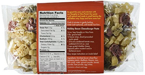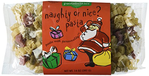 -. Binding : Misc. -. Brand : The Pasta Shoppe -. EAN : 0608819911342 -. Feature : Each package has a combination of unique pasta shapes / Three natural colors / 6-8 Servings per package / Recipe included on back of package for Holiday Bacon Cheeseburger Pasta / Pasta Shapes: Santas and Presents -. IsAdultProduct : 0 -. PackageQuantity : 2 -. ProductGroup : Grocery -. ProductTypeName : GROCERY -. Title : Naughty or Nice? Pasta Santas and Presents Shaped Holiday Christmas Pasta 2 Pack -. UPC : 608819911342