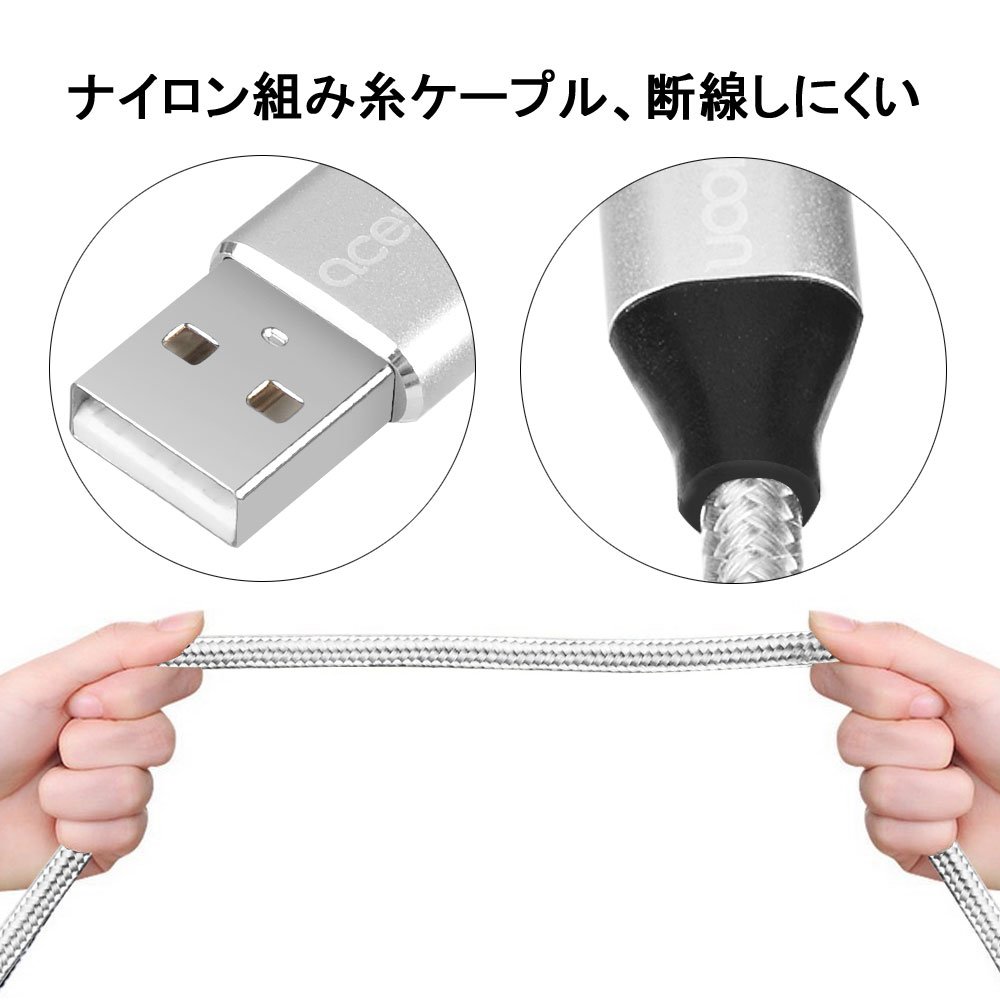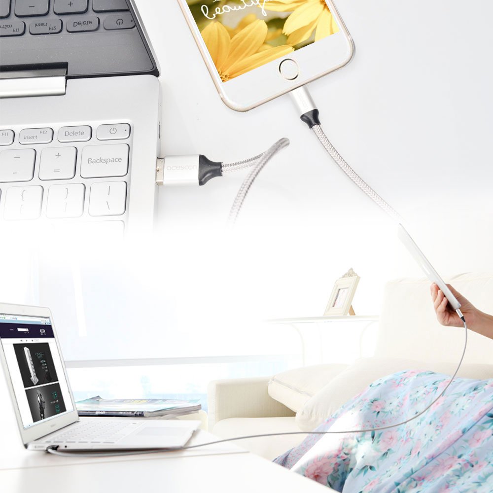Because aluminum alloy is adopted as a connector and the cable part is covered with silver nylon material which has high quality feeling and high durability at the same time, the connecting portion between the cable and the connector is completely inserted in the rubber, it is robust and disconnected
