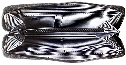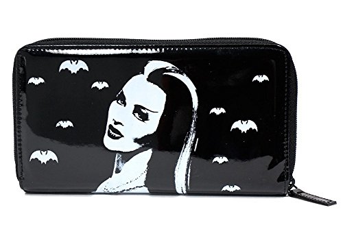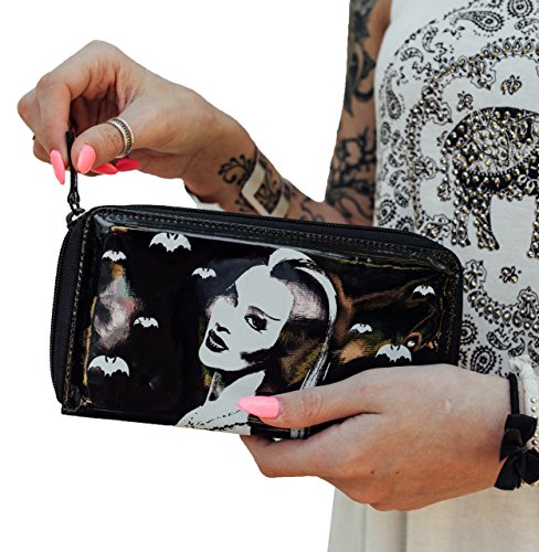 -. Feature : Black and white shiny retro viny gothic wallet featuring original Lily Munster portrait surrounded by vampire bats / Features clear ID slot, multiple card pockets, billfold slots and zippered change pocket. 8 long by 4.25 tall and .75 width / Full zip closure and fully lined / Measures 8 inches by 4.25 inches with .75 inch depth / Vegan friendly
