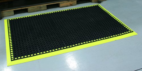 A tough, industrial mat, manufactured of rubber compound with PVC edging