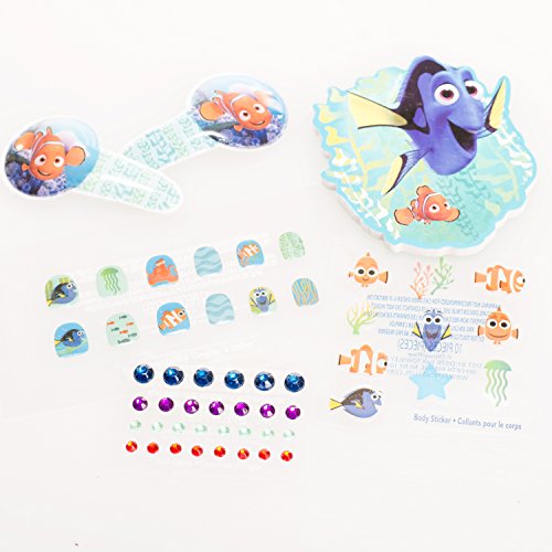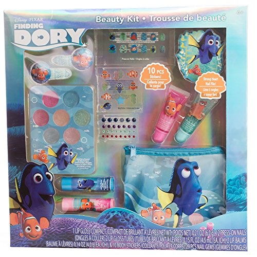 -. Feature : DELUXE SET INCLUDES IT ALL! 1 mixed berry lip gloss compact, 12 press-on nails, 1 nail file, 2 flavored glittery gloss tubes, 2 flavored lip balms, 10 body stickers, 29 nail gems, 2 hair clips and 1 carrying case. / BEST COMBINATION OF FLAVORS AND FUN Balms and glosses apply smoothly for moisturizing or glossy look, with most-loved flavors: Bubble Gum, Raspberry and Watermelon. / SAFE AND NON-TOXIC Water-based formula makes these cosmetics safe for young ones aged six years old and up, including tweens and teens. Lipgloss is one of the easiest, yet modest ways to introduce your little P.R.Incess to lipstick or makeup. / PRETEND PLAY FOR GIRLS OF MOST AGES Big fun for slumber parties or any pretend cosmetic play date with kids 6 and up. With lots to choose from, there's something for everyone. / PERFECT AS A BIRTHDAY OR HOLIDAY GIFT Each item is decorated with an image of everyone's favorite Finding Dory characters: Dory and Nemo.